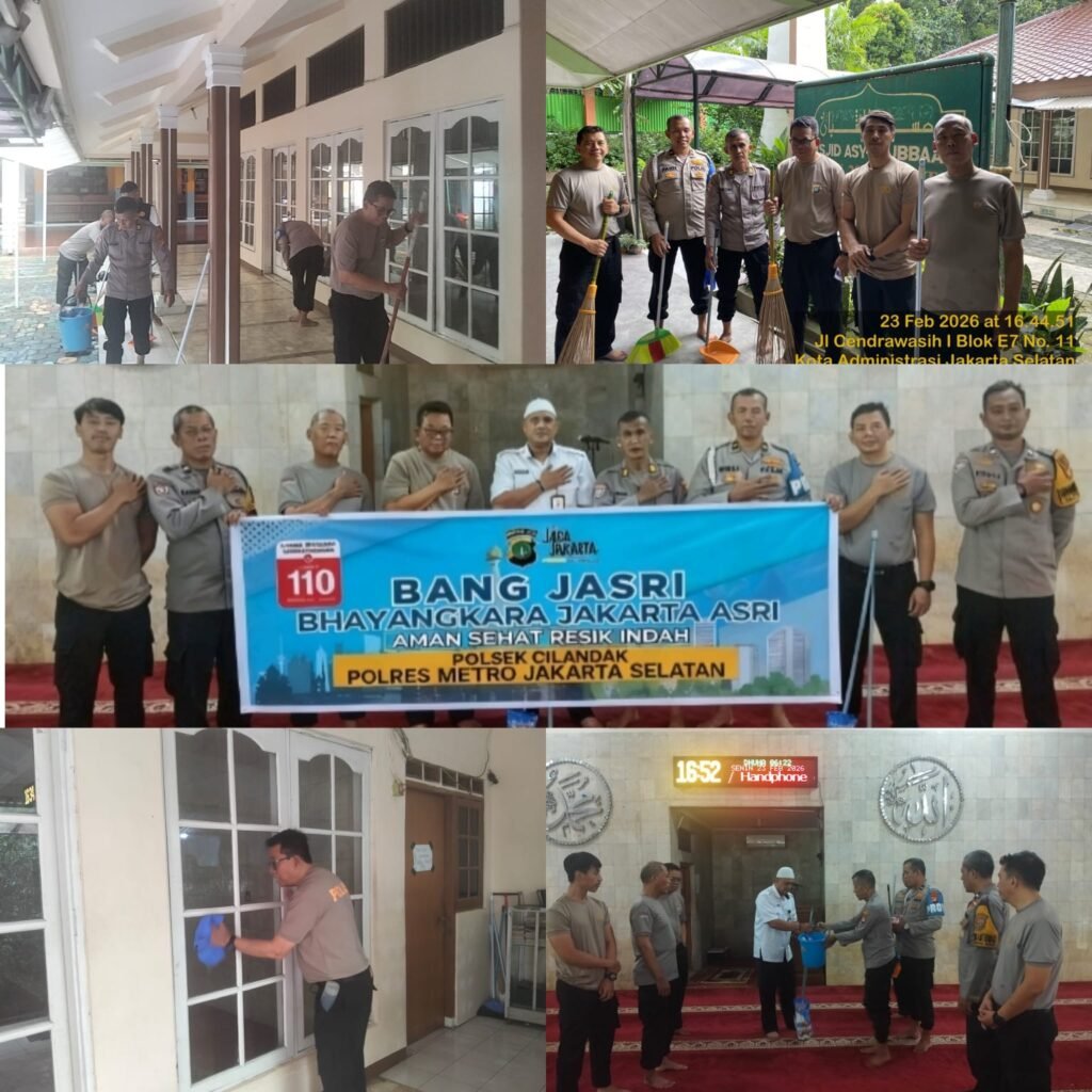 Jakarta Selatan – Dalam rangka mewujudkan program “BANG JASRI” (Bhayangkara Jakarta Asri) , jajaran Polsek Cilandak melaksanakan kegiatan bakti religi di Masjid Asy-Syubbaan, Jalan Melati, Kelurahan Cilandak Barat, Kecamatan Cilandak, Jakarta Selatan, pada Senin (23/2/2026) pukul 15.30 WIB hingga selesai.