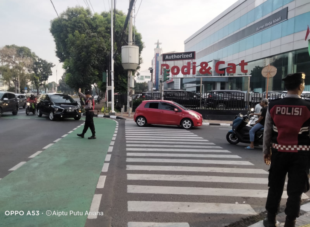 Jakarta Selatan – Personel Samapta Polsek Tebet melaksanakan kegiatan pengaturan lalu lintas di TL Persojo, Jl. Prof. Dr. Soepomo, S.H., Kelurahan Tebet Barat, Kecamatan Tebet, Jakarta Selatan, Kamis (17/4/2026).