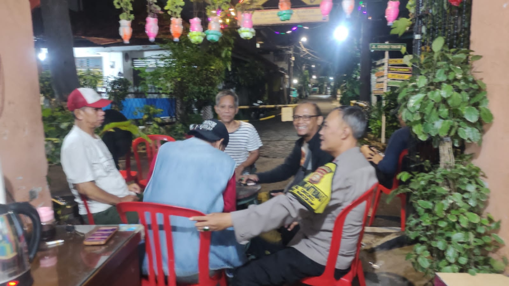 Dalam kunjungannya, Aiptu N. Krisnadi berkoordinasi langsung dengan Bapak Ratno selaku petugas keamanan setempat serta berdialog dengan beberapa warga RW 02 yang sedang berjaga.